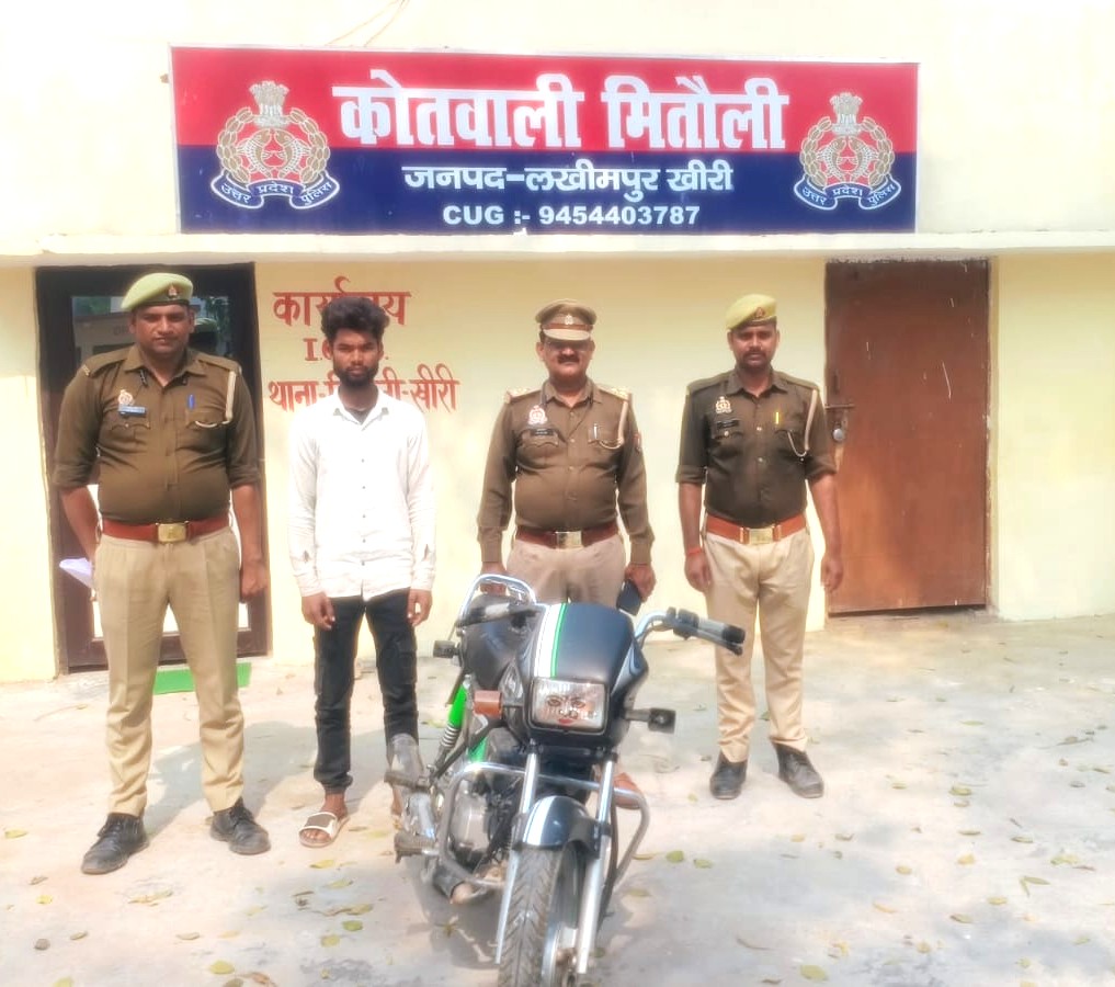 मितौली (खीरी)। जनपद में अपराध एवं अपराधियों के विरुद्ध चलाए जा रहे अभियान के तहत कोतवाली मितौली पुलिस को एक बड़ी सफलता मिली है। पुलिस टीम ने एक मोटरसाइकिल चोर को चोरी की बाइक के साथ गिरफ्तार कर लिया।
